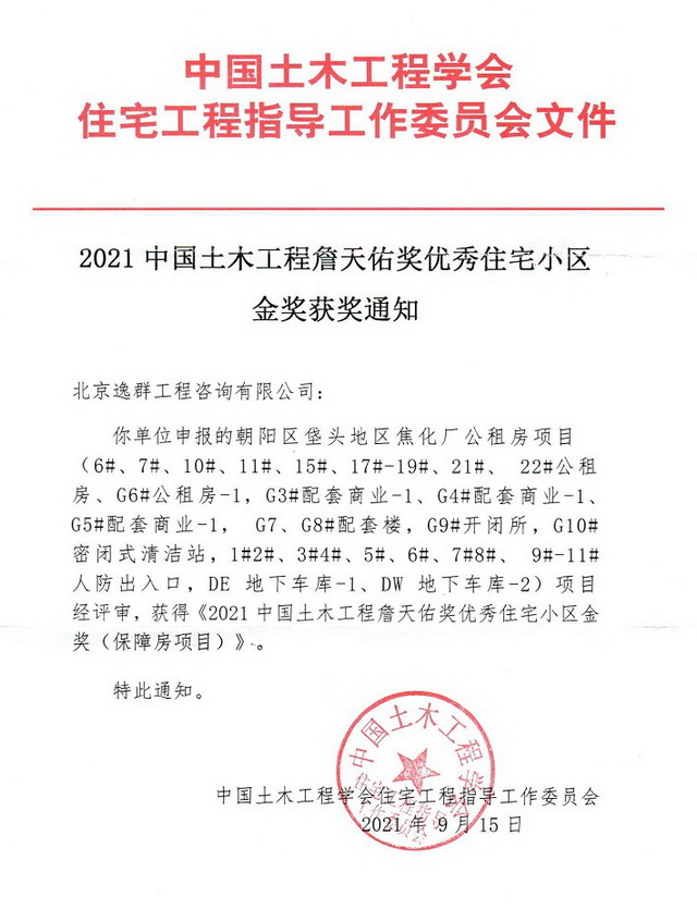 2021年中國土木工程詹天佑獎”名單于202197日公布,我公司參建的朝陽區(qū)垡頭地區(qū)焦化廠公租房項目榮獲“2021年中國土木工程詹天佑獎優(yōu)秀住宅小區(qū)金獎”!