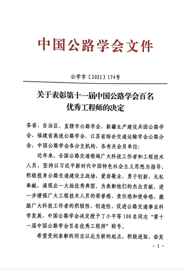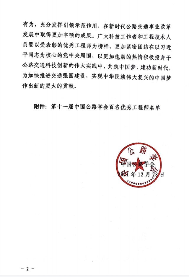 祝賀張海斌同志榮獲“第十一屆中國(guó)公路學(xué)會(huì)百名優(yōu)秀工程師”稱號(hào)
