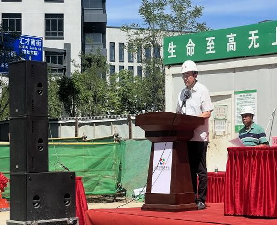 公司總經(jīng)理張明代表監(jiān)理單位致辭。封頂儀式現(xiàn)場(chǎng)橫幅掛立,一派喜慶,建設(shè)、監(jiān)理、施工單位等各方領(lǐng)導(dǎo)到場(chǎng)。